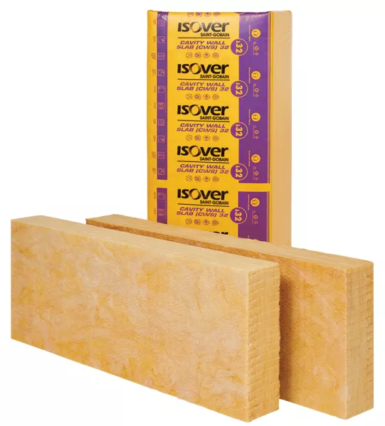 The ISOVER Cavity Wall Slab (CWS) 36 is a glass mineral wool slab providing thermal performance in external masonry cavity walls. Manufactured with a water repellent binder, the strong, resilient and flexible slabs are 455mm wide to fit between standard wall tie spacing.